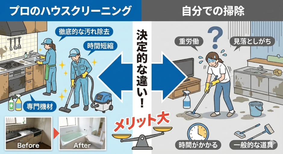 | 比較項目 | 自分での掃除(DIY) | ハウスクリーニング(プロ) |